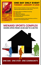Mat-Su Project Homeless Connect is taking place on Tuesday, January 27, 2026, from 10:00 a.m. to 2:00 p.m. at the Curtis D Menard Memorial Sports Center in Wasilla for this special annual event.